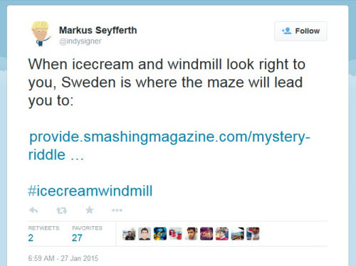 That’s exactly how the riddle came to be. As usual, the task was to watch out for the file name and construct the right hashtag. We created a series of animated GIFs, and each GIF contained (at least) one hidden hashtag. The job was to discover the hashtag as soon as possible. And if the guess for a hashtag was right, you would find a tweet with that hashtag leading you to the next level. Once you’ve reached the last level, you’d need to tweet out all the hints in one single tweet to @smashingmag.