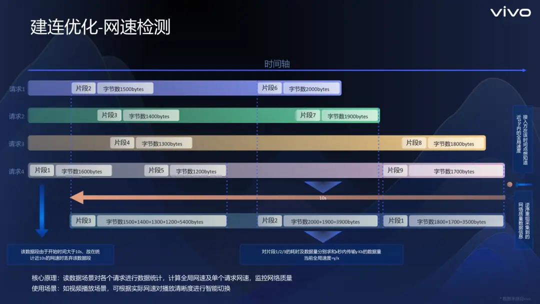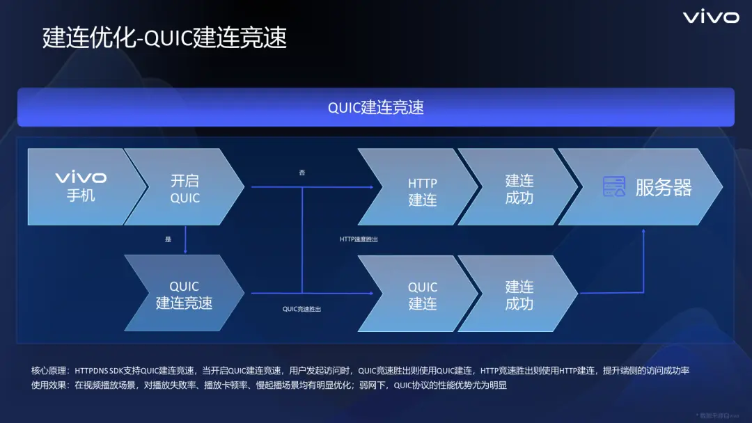 • 二是業務建連優化,通過網絡診斷、網速檢測、長連接優化、最佳路由、QUIC 建連競速,提升業務訪問的成功率和降低業務訪問時延,提升我們 vivo 手機用户的使用體驗;