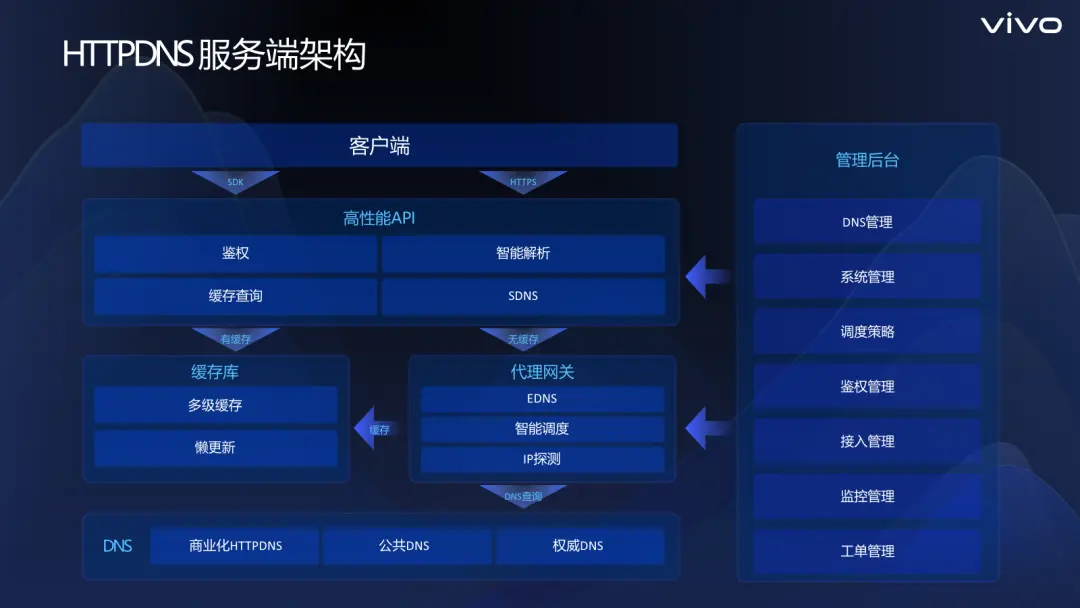 下面我們介紹 vivo HTTPDNS 服務端的架構,HTTPDNS 服務端主要提供高性能 API、緩存庫、代理網關等能力;高性能API提供智能解析、鑑權、緩存查詢等能力;緩存庫提供多級緩存、懶更新等能力;代理網關提供 EDNS、智能調度、IP探測等能力。通過這些能力給 vivo 用户提供高可用,低時延的HTTPDNS 解析服務。同時,也提供 HTTPDNS 管理後台,支持 DNS 管理、系統管理、調度策略管理、鑑權管理、接入管理等能力。