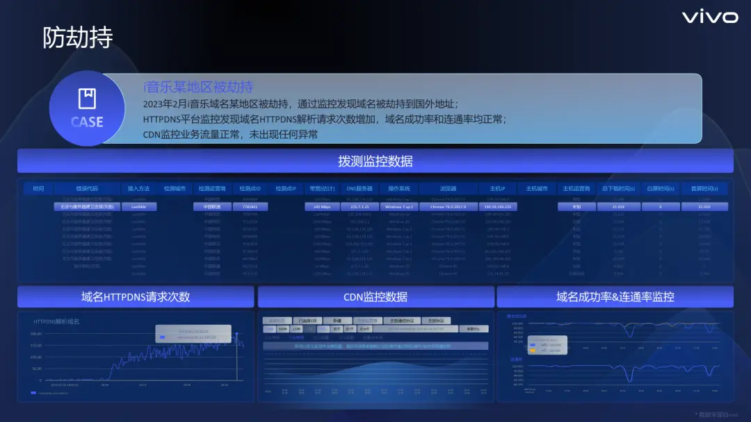在防劫持方面, 2023年2月 i音樂域名某地區被劫持,通過監控發現域名被劫持到國外地址;vivo HTTPDNS 平台監控發現域名使用 HTTPDNS 解析正常,域名成功率和連通率均正常;CDN 監控業務流量正常,未出現任何異常。