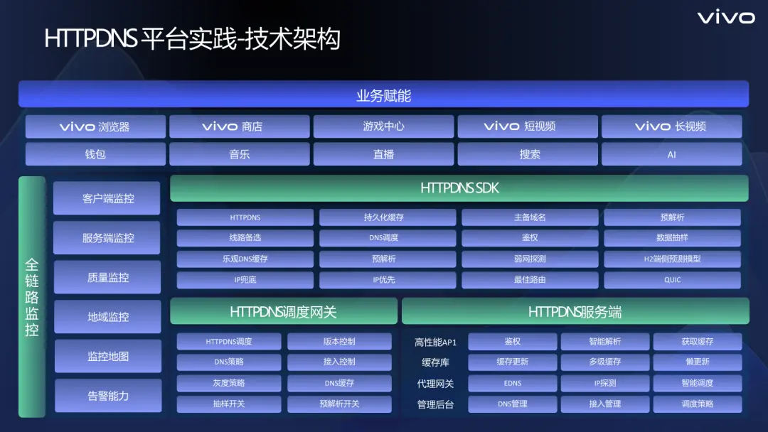 • 全鏈路監控為 vivo HTTPDNS 平台提供端到端的全鏈路監控能力,為業務的發展提供數據支撐。