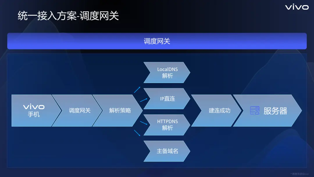 • 統一調度網關作為 vivo HTTPDNS 平台實踐 SDK 與服務端的橋樑,使得端到端的優化策略得以串聯。