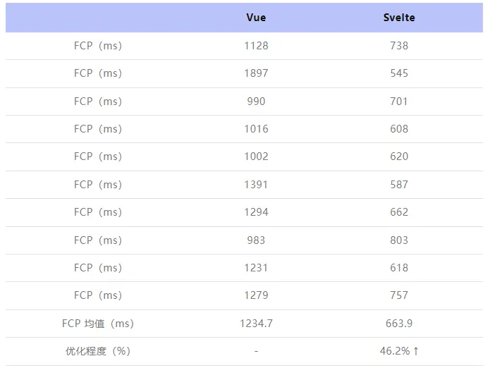 在本地進行10次平均性能測試,發現 Svelte 的 FCP 指標比 Vue 要快了約46%,説明 Svelte 的首屏渲染速度比 Vue 快了不少,提升很明顯。