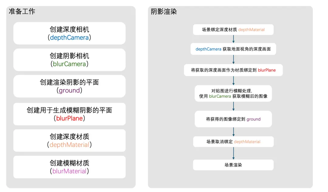 - 通過獲取底部視角的深度信息結合自定義shader來生成地面陰影,對頁面的性能沒有明顯的損耗的同時達到一個比較好的效果。