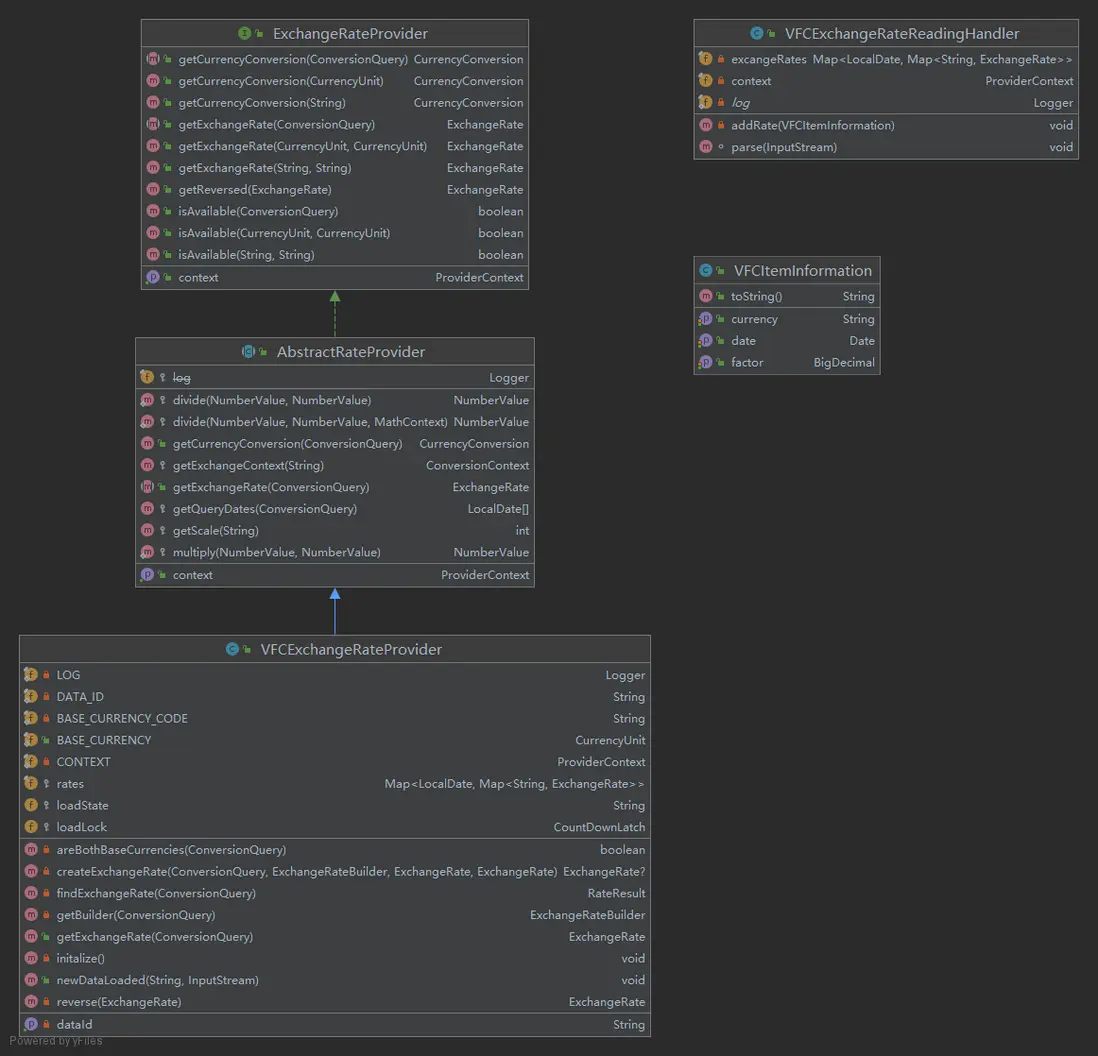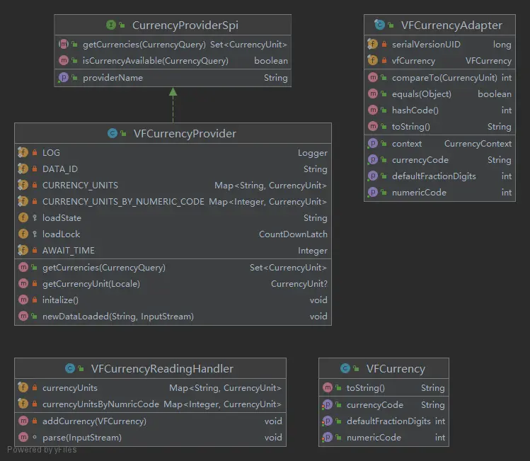 CurrencyProviderSpi和LoaderService.LoaderListener,用於擴展貨幣類型和實現擴展的貨幣類型的數據加載。其中包含的數據解析類VFCurrencyReadingHandler,數據模型類VFCurrency等代碼省略。對應的實現關聯類圖為;