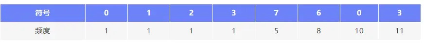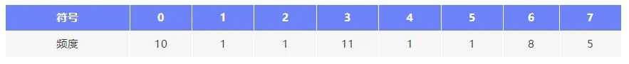 假如待編碼的字符總共38個符號數據,對其進行統計,得到的符號和對應頻度如下表:
