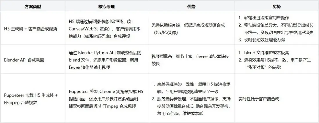 為解決擬我形象在多場景展示中依賴 3D 渲染導致的性能與接入問題,本文提出將形象預先導出為視頻或動圖資源。對比三種技術路徑後,最終選擇 Puppeteer + H5 渲染幀 + FFmpeg 合成視頻 的方案,實現了渲染效果一致、服務端批量處理和低接入成本,為擬我形象的規模化應用提供了高效可擴展的技術基礎。