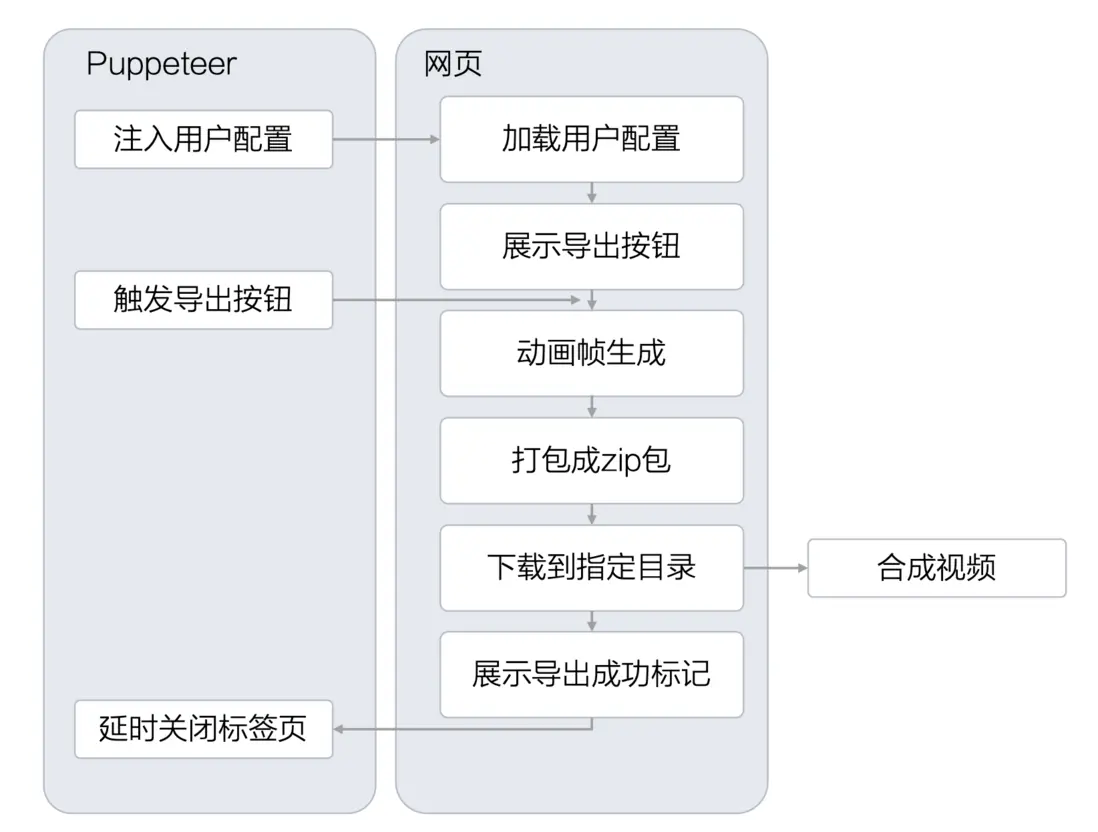 具體實現拆分為三個部分,分別為用於幀輸出的頁面開發、Puppeteer流程設計以及視頻合成。