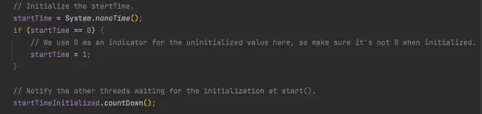 1.初始化 startTime,這裏與上文中 start 方法內部對應。初始化後,利用閉鎖 CountDownLatch 通知等待線程往下執行。