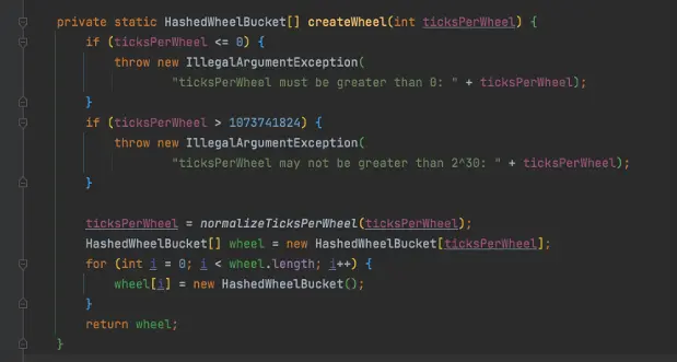 這樣就避免了在每一個槽中都需要檢測所有任務是否需要執行。在 HashedWheelTimer 的構造函數中,最重要的是 createWheel 方法,忽略基本的參數校驗,只看方法主流程,首先是對時間槽數量的規範化處理,處理方式為將構造時傳入的數量,修改為大於等於它的最小的 2 的次冪。為什麼這樣處理以及處理的具體方式,有興趣可以研究下源代碼。