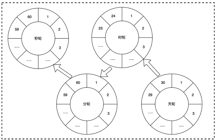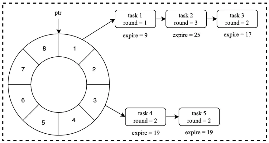 類比循環數組的思想,後人設計了帶 round 的時間輪,這種時間輪的結構如下圖所示: