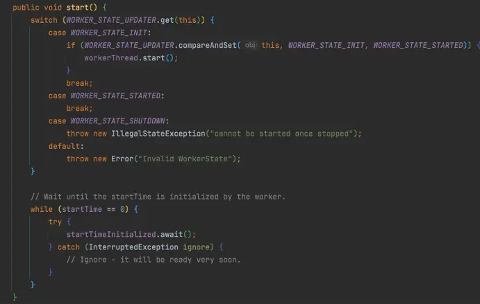 這裏我們展開比較重要的 start 方法,首先獲取 worker 的運行狀態,如果是初始化狀態,則更新成已啓動狀態,啓動 workThread 線程,若是其他狀態,則做其他相應的處理。接着是等待 workThread 將 startTime 初始化完成(在 Worker 的 run 方法中初始化完成),之所以需要等待 startTime 初始化完成,是因為 newTimeout 方法中,start 方法調用後也用到了這個 startTime,不這樣做,任務的截止時間計算會有問題。