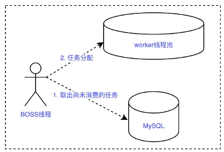 模型類似於 Netty 中的 BOSS-WORKER 的模式,BOSS 線程負責定時從數據庫中查出未消費的任務,並將其分配給 worker 線程池進行消費,如圖 4.1 所示。