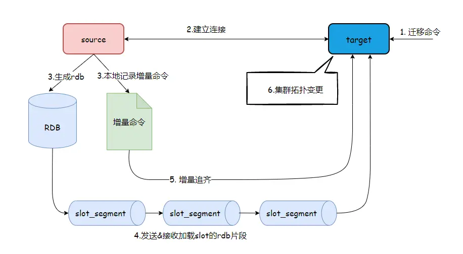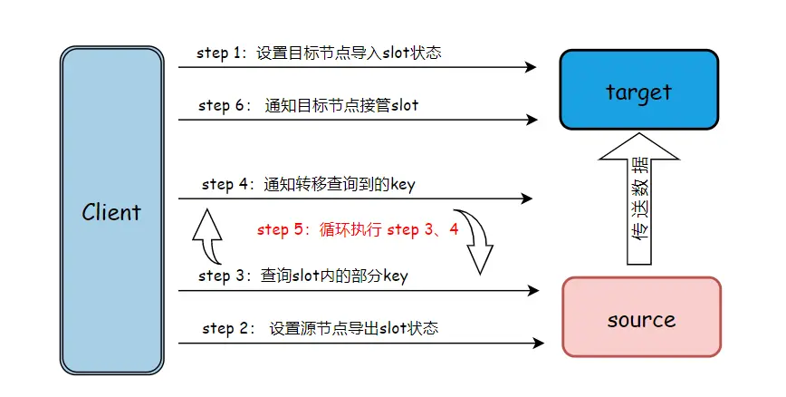 上圖所示的遷移步驟中,步驟 1-2 是對待遷移 slot 進行狀態標記,方便滿足遷移過程中數據訪問,步驟 3-4 是遷移的核心步驟,這兩個步驟操作會在步驟 5 調度下持續不斷進行,直到待遷移 slot 的鍵值數據完全遷移到了目標節點,步驟 6 會在數據轉移完成後進行,主要是發起集羣廣播消息更新集羣內節點 slot 拓撲。