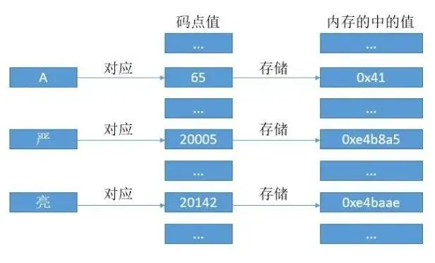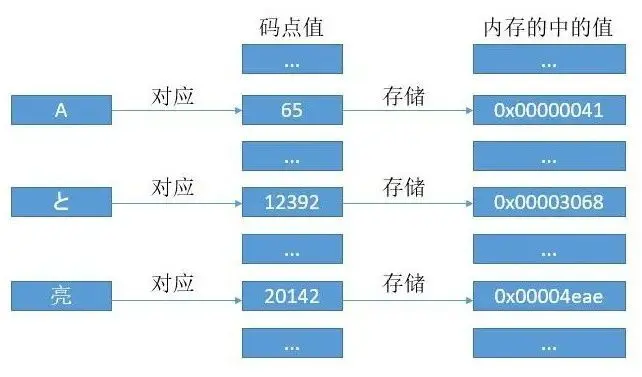 一個 Unicode 的碼點值會對應一個數字,對於Basic平面的字符,我們直接把這個數字存到內存中。