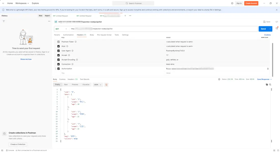 我們嘗試不加token和添加token的方式進行訪問,可以看到微服務的攔截及轉發功能均已成功。