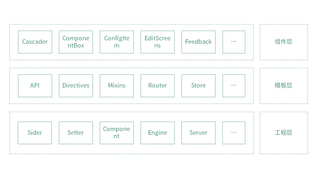 整個架構設計分為組件層、模板層以及工程層,面向垂類場景提供“1+1+n”的模式,即:其基於1套無代碼引擎和1套腳手架CLI,面向不同行業領域提供n個通用客户的SaaS應用。