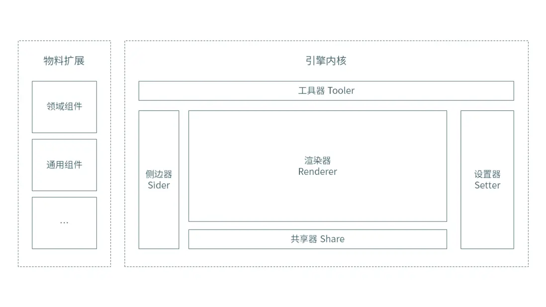 整個技術實現,主要分為兩大部分,其中物料擴展可以面向業務開發提供私有化的組件物料庫,而引擎內核則保留了整個低代碼編輯器的核心構件,基於“最小內核”提供泛生態擴展。