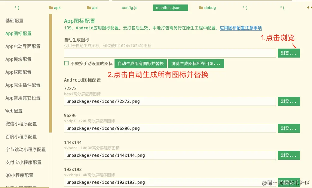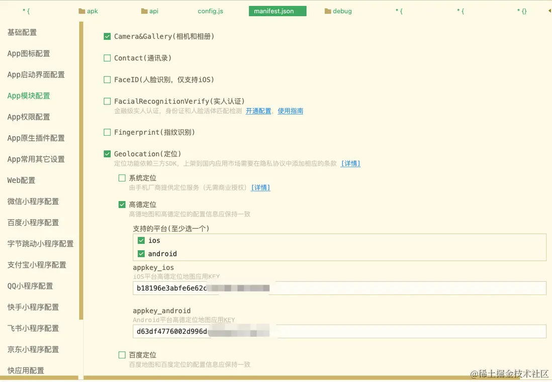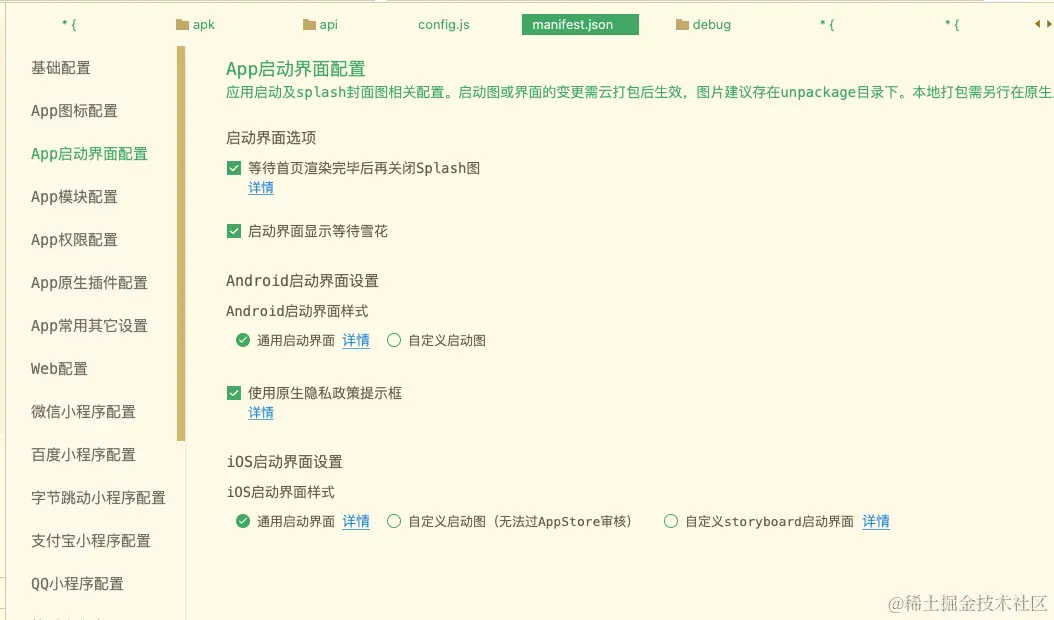 在app啓動界面配置勾選後會在項目中自動添加androidPrivacy.json文件,可以雙擊打開自定義配置以下內容: