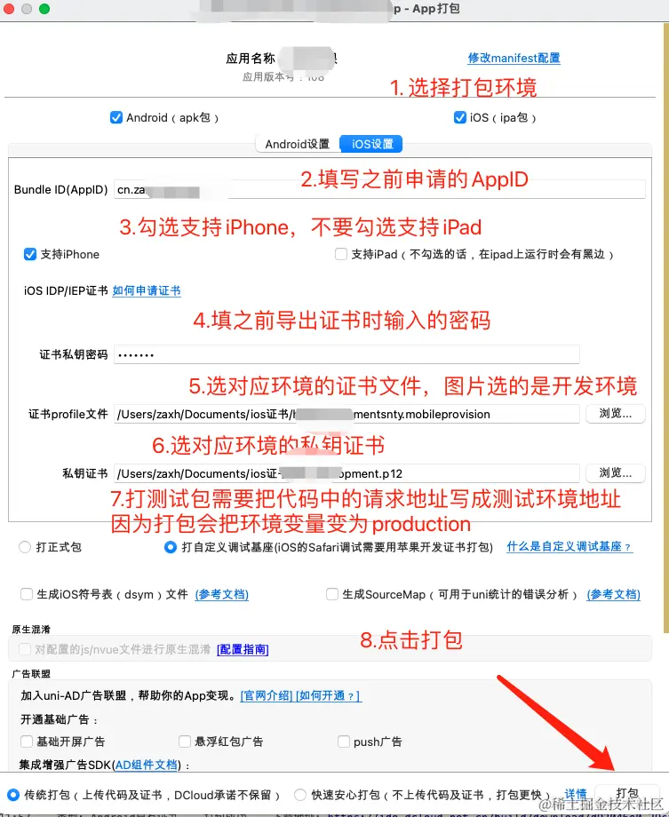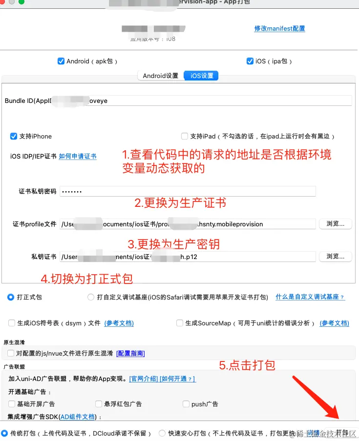 和構建測試包基本差不多,需要變更的就是ios證書的profile文件和密鑰證書