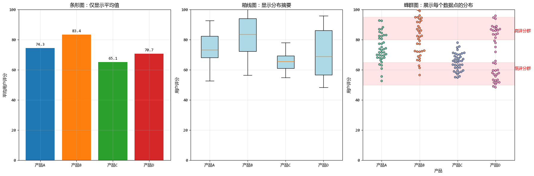 - 但只有蜂羣圖清晰地揭示了產品D實際上有兩個明顯的用户羣體:一個低評分羣體和一個高評分羣體
