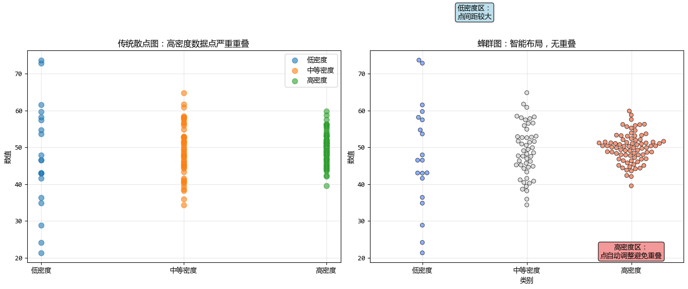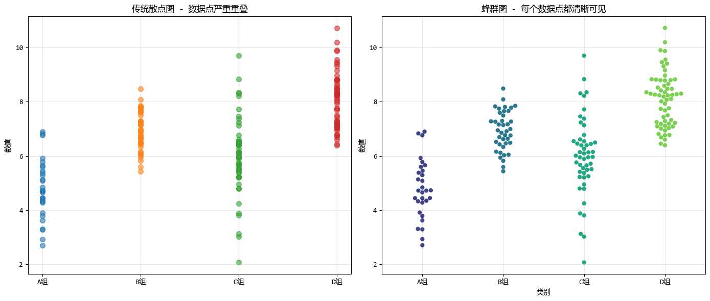 與傳統的條形圖或箱線圖不同,蜂羣圖不進行任何數據聚合,而是展示每一個原始數據點,避免了信息丟失。