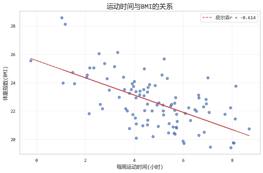 # 模擬數據:運動時間(小時/周)與體重指數(BMI)