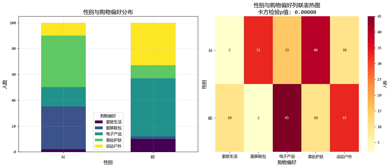 當兩個變量都是分類變量(定類數據)時,我們可以使用卡方檢驗來分析它們之間是否存在關聯。