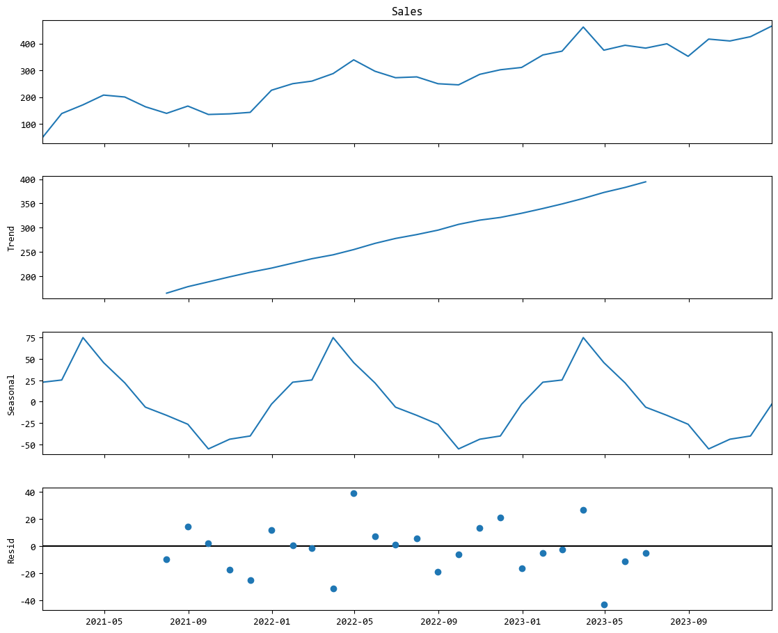 # model='additive' 表示加法模型(銷量 = 趨勢 + 季節 + 噪音)