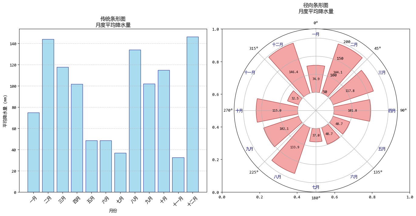 徑向條形圖利用了極座標系,將類別(月份)分佈在圓周上,將數值(降水量)映射到徑向長度上。