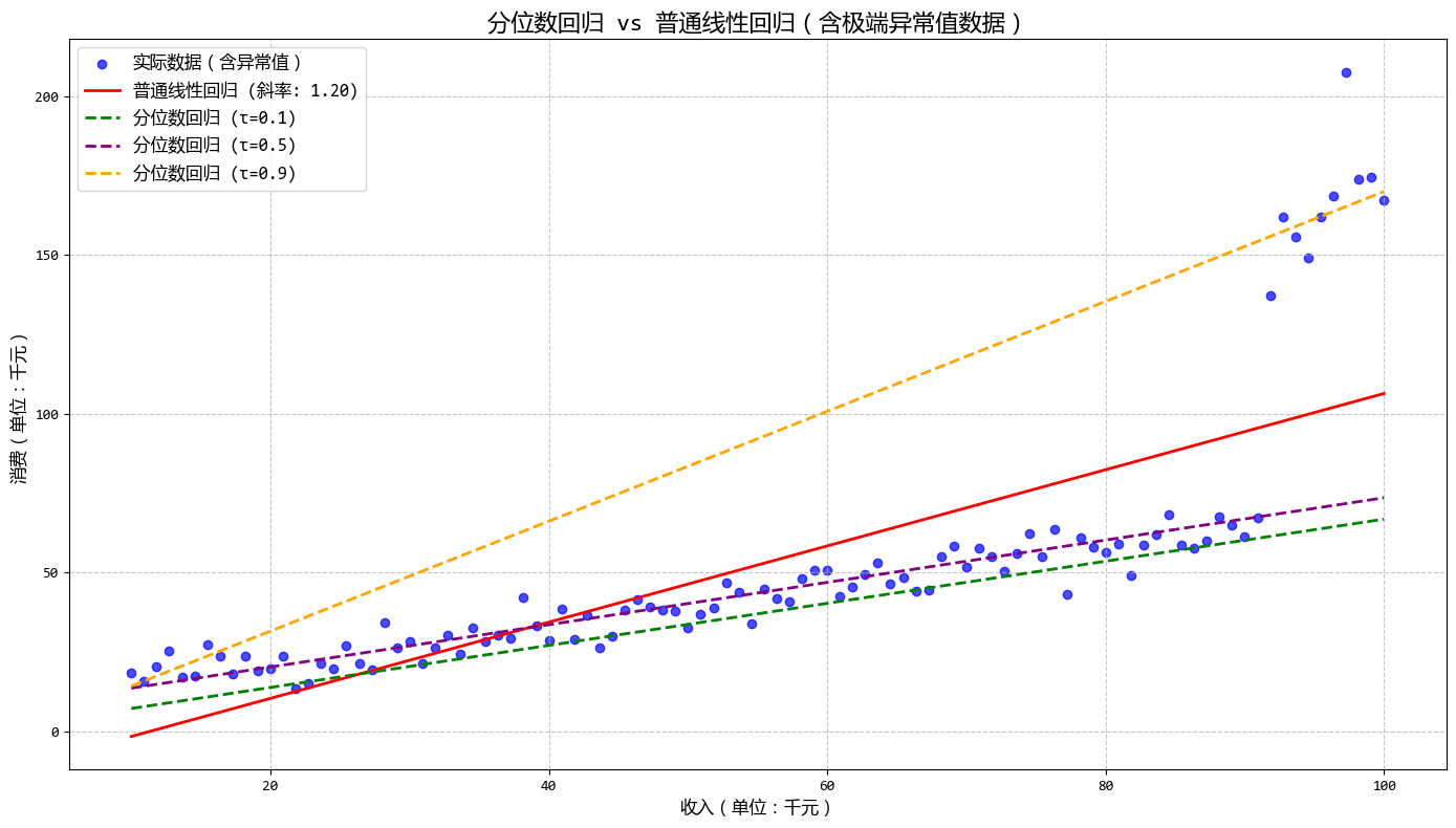- 異常值很多: 考慮 分位數迴歸 或 Huber迴歸(魯棒迴歸)。