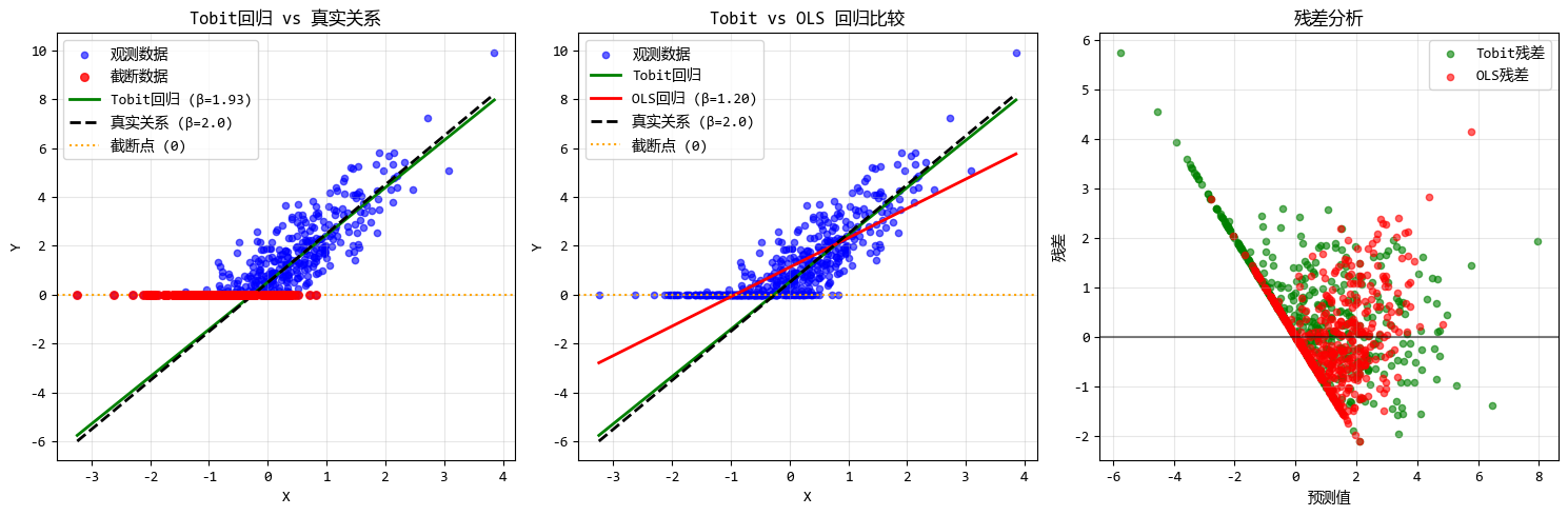 print(f"係數估計偏差 (Tobit): {abs(tobit_model.beta - true_beta):.3f}")