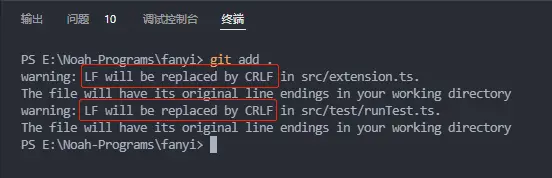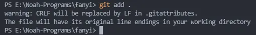可以看到使用.gitattributes配置文件後執行git add,所有不是指定換行符的文件都會被自動更換為你指定的換行符,例如我這裏指定了lf,那麼 git add . 後,不是以 lf 換行的文件都會被轉換為 lf ,並在終端輸出warning: CRLF will be replaced by LF in xxxx/filename,如圖 👇