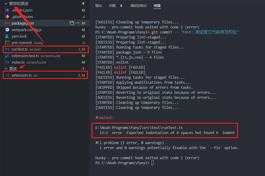 添加玩上述代碼後,我們通過測試,將兩個文件的縮進改為不符合規範的情況,然後將其中一個文件暫存後,我們運行git commit後發現終端的報錯中,只有一個文件的 lint 報錯信息,另一個文件的報錯並沒有出現。