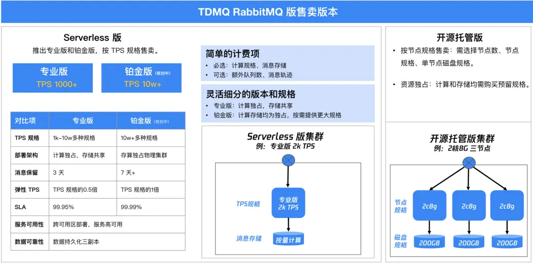 當前 TDMQ RabbitMQ Serverless 版提供專業版和鉑金版兩種規格,以滿足不同業務場景的需求,按照 TPS 規格對外售賣。