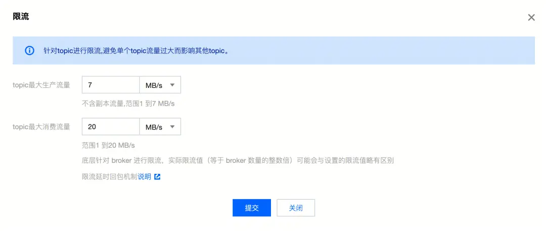 客户可以根據自身需求配置 Topic 的限流。例如,對於 Topic:Test,2副本,可以配置寫入限流 7MB/s(已計算副本),消費限流 20MB/s。