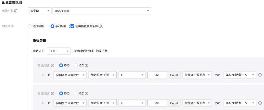 用户可以打開監控數據查看流量的最大值,如果 (流量的最大值 × 副本數) > 購買時的峯值帶寬,則表明至少發生過一次限流。可通過配置限流告警得知是否發生限流。
