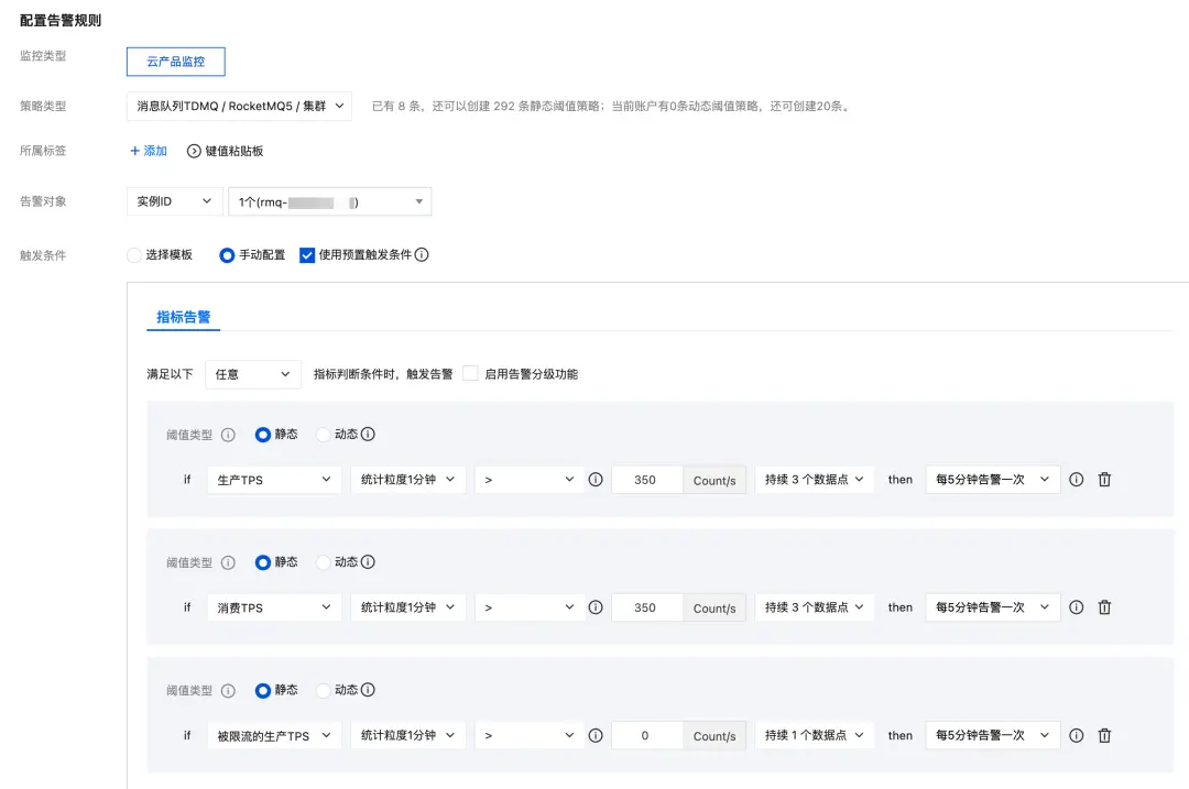 您可以利用 TDMQ RocketMQ 版控制枱的監控告警能力實現對集羣負載的實時觀測,提前發現 TPS 水位風險並及時操作升配,保證資源充足,避免觸發限流。告警策略建議: