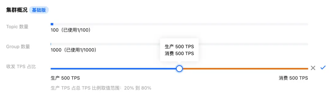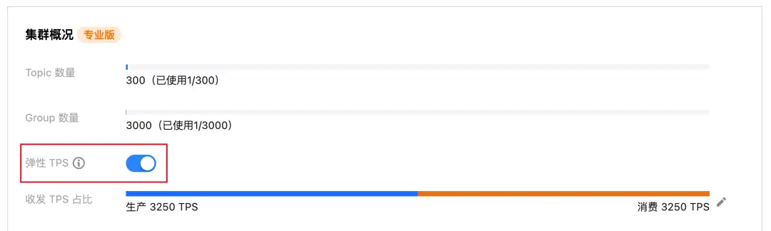 為了兼具隔離性和靈活性,發送消息與消費消息的 TPS 配額不共享,同時支持自定義配額比例(默認配額比例為1 : 1 )。