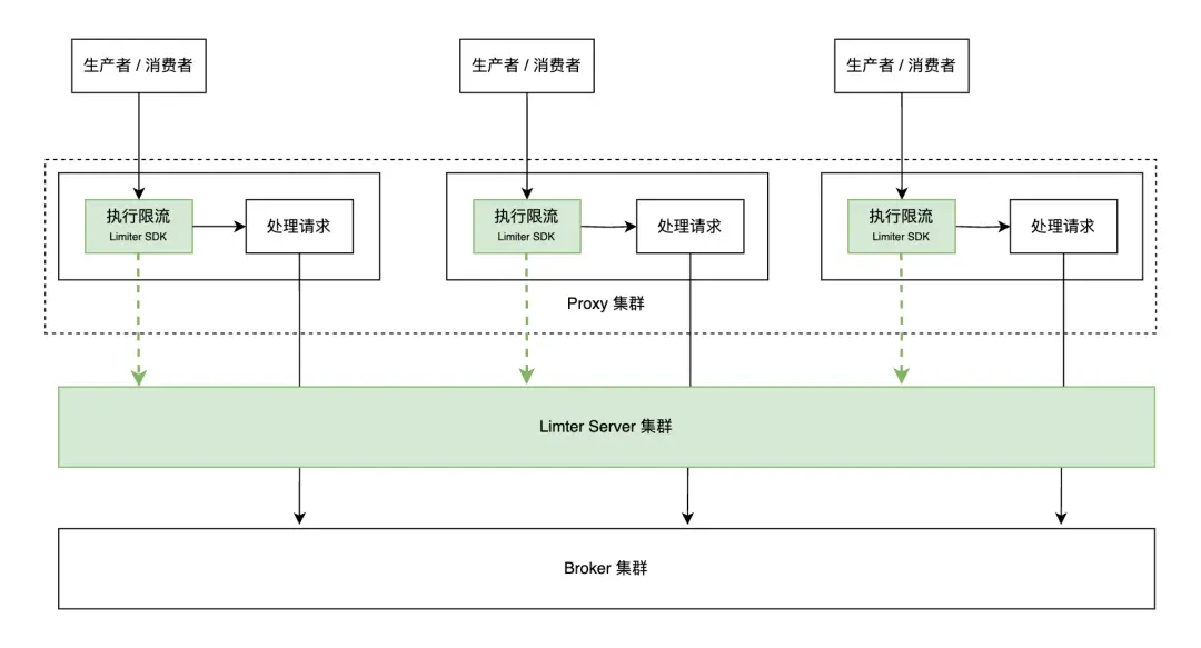 TDMQ RocketMQ 版通過在計算層 (Proxy) 接入分佈式限流系統 (Limiter) 實現集羣級讀寫流量控制,其核心機制是:Proxy 節點在處理客户端 SendMessage / PullMessage 請求前需向 Limiter 申請 Token,若申請失敗則立即拒絕請求並返回錯誤。Proxy 內部集成了 Limiter SDK,該 SDK 提供 Token 申請 API,並負責與 Limiter Server 通信,通過這種集中式 Token 管理實現對核心存儲層 (Broker) 的保護。