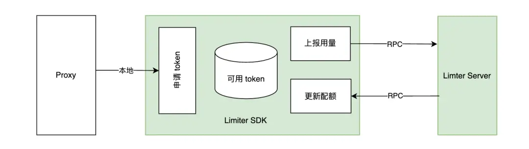 實際上從服務端的角度看,TDMQ RocketMQ 版執行限流的主要目的是防止核心存儲層過載,而非追求 100% 精準的流量控制,即 SDK 與 Server 之間的強同步並不是必須的。因此,為了在限流性能和限流精度之間取得平衡,Limiter 採用了一種【先消費後結算】的 Token 管理機制:Token 申請過程在 SDK 內部閉環,SDK 會週期性地向 Server 上報 Token 使用量並刷新配額。在這種機制下: