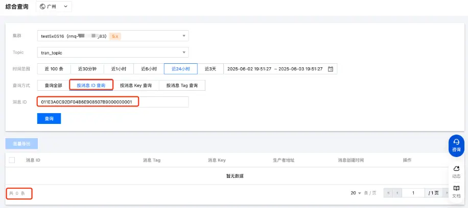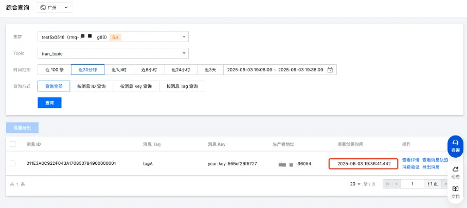 4、運行代碼後,在控制枱的消息查詢頁面,可以看到已經有一條投遞完成等待消費的消息。