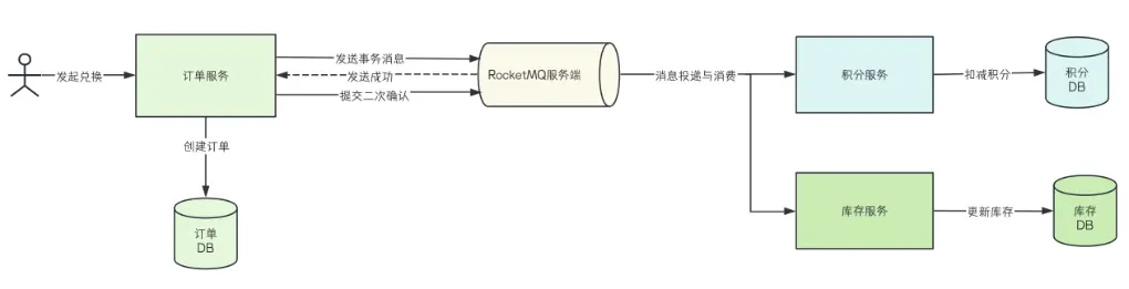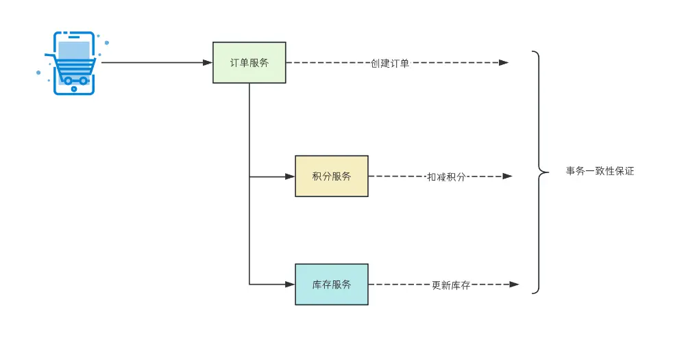 在電商平台中,積分兑換商品這一常見功能就涉及到分佈式事務,用户發起兑換後,可能涉及創建兑換訂單、扣除用户積分、通知發貨服務、扣減庫存等一系列動作,此時就要保證訂單服務和多個下游業務執行結果的最終一致性,如果積分扣除成功但訂單創建失敗,會導致用户積分被扣但未獲得商品,如果訂單創建成功但積分扣除失敗,會導致用户獲得商品但未扣除積分。