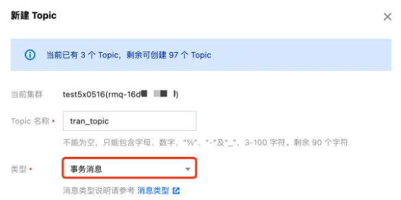 1、首先登錄騰訊雲控制枱,新建一個消息類型為事務消息的 Topic。