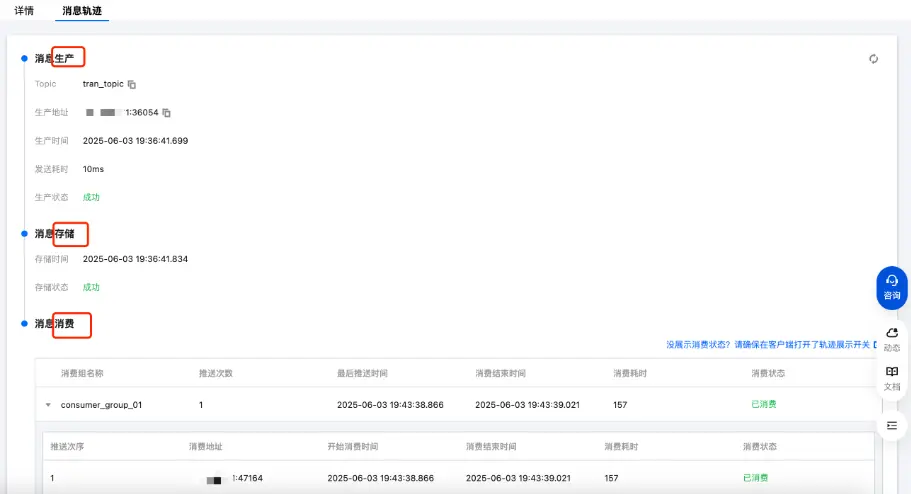 5、啓動消費者,訂閲這個 Topic,成功消費消息後,在騰訊雲控制枱查看消息軌跡: