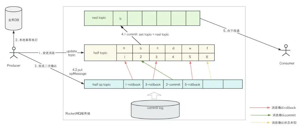 - 確認結果為 Commit 時,服務端會將事務消息繼續向下投遞給消費者,確認結果為 Rollback 時,服務端將會丟棄該消息,不再向下投遞。