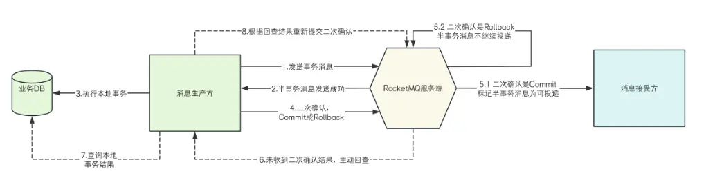 - 生產者收到請求後提交二次確認結果,邏輯再次回到第5步,此時如果生產者服務暫時不可用,則 RocketMQ 服務端會在指定時間間隔後,繼續主動發起回查請求,直到超過最大回查次數後,回滾消息。
