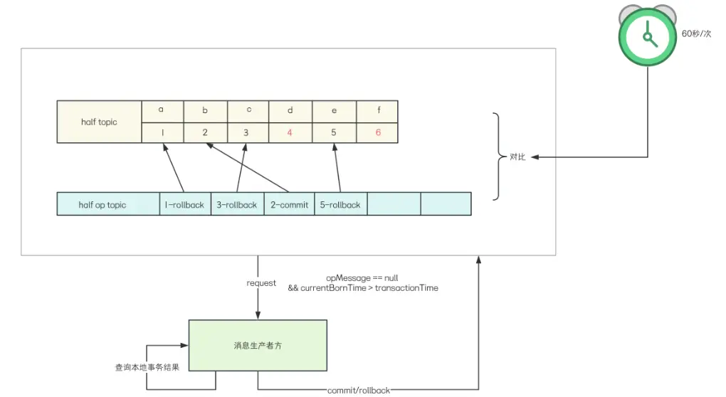 Half Message 寫入後,可能會因為種種原因,導致 RocketMQ 服務端一直收不到二次確認結果,比如網絡異常、生產者服務暫時不可用、本地事務死鎖導致執行時間超長等,此時,就需要 RocketMQ 服務端主動去詢問生產者服務本地事務是否執行成功,以決定 Half Message 的最終去留。