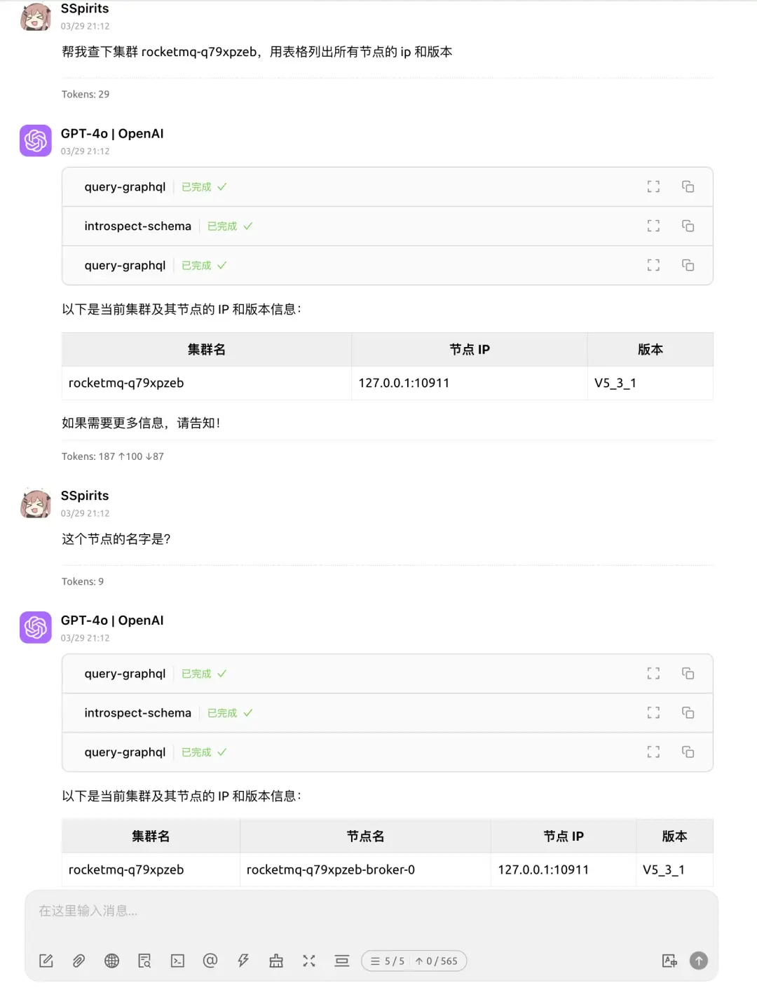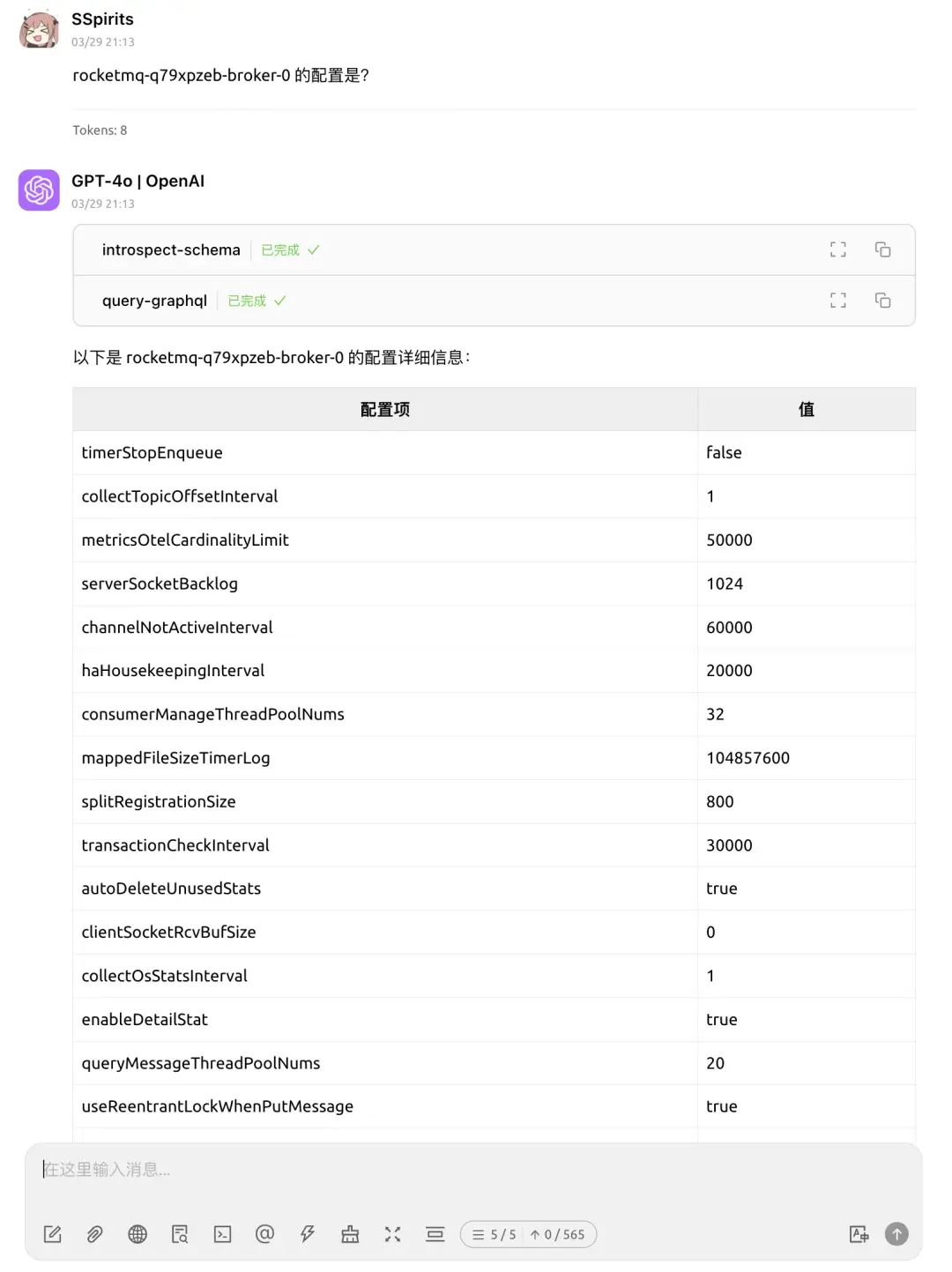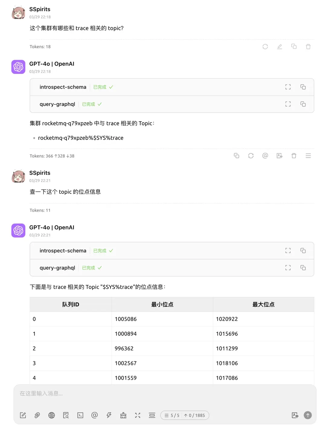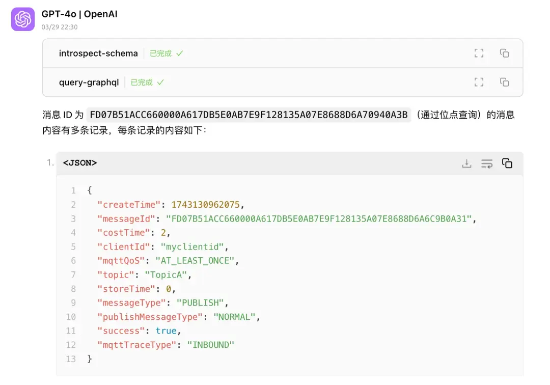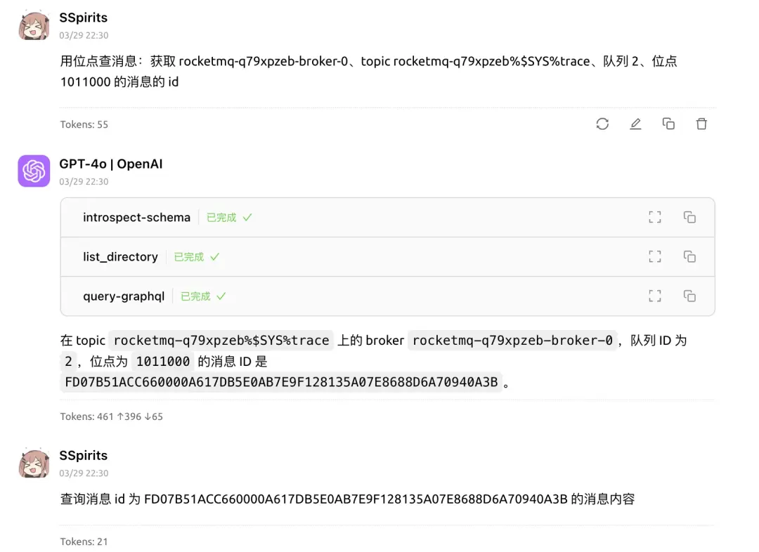 藉助 LLM + Chatbox + MCP + GraphQL 的組合,可以用自然語言查詢 RocketMQ 集羣的狀態、Topic 的信息、消息的內容等。理論上只要是在我們系統內的信息,都可以通過一次自然語言交互查出來,並且可以連續追問直到找到問題根因。再也不需要訪問一大堆服務,編輯命令行參數/SQL 或者在前端界面之間跳來跳去。