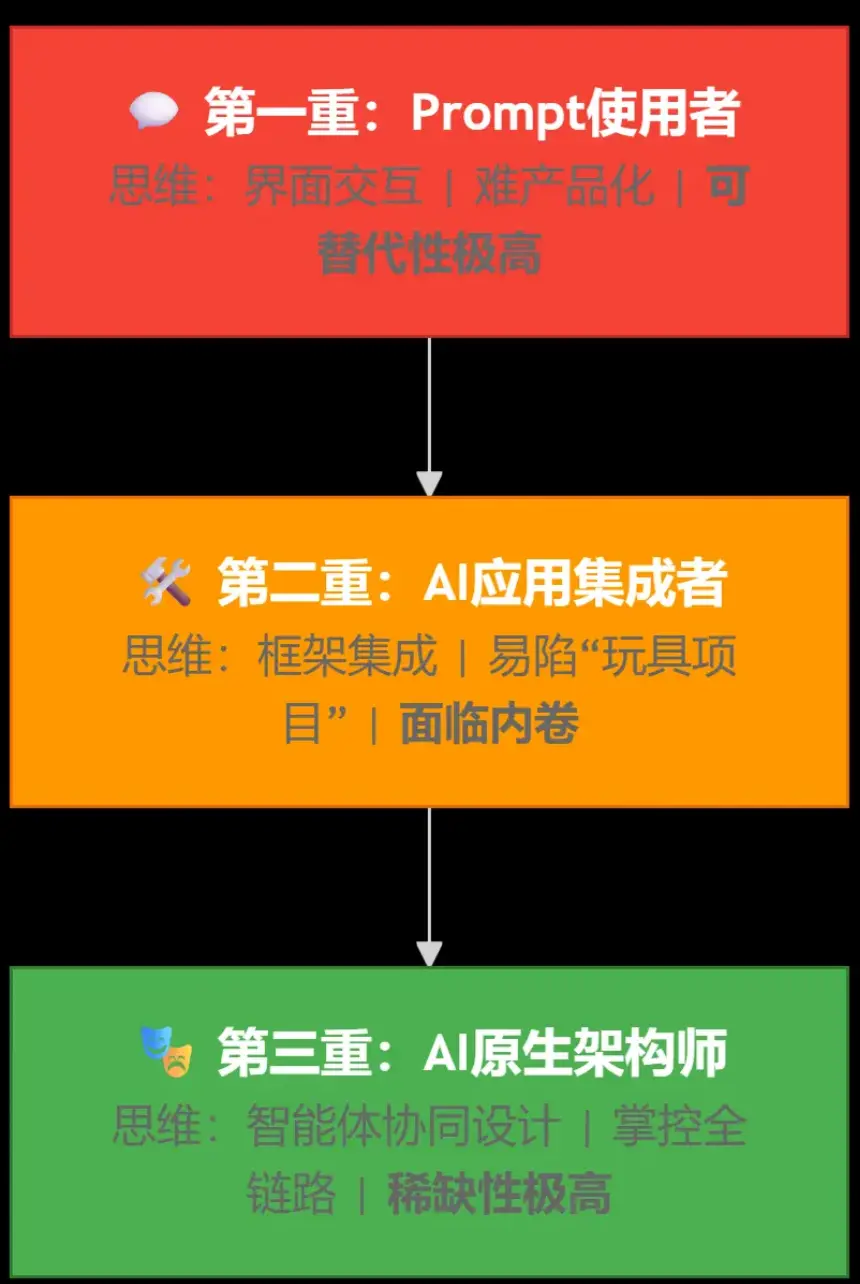 - 第二重:AI應用集成者:能用LangChain等快速搭Demo,但易陷入 “玩具項目”陷阱,面對生產環境的幻覺、高延遲、高成本問題手足無措。狀態:焦慮的“縫合者”。